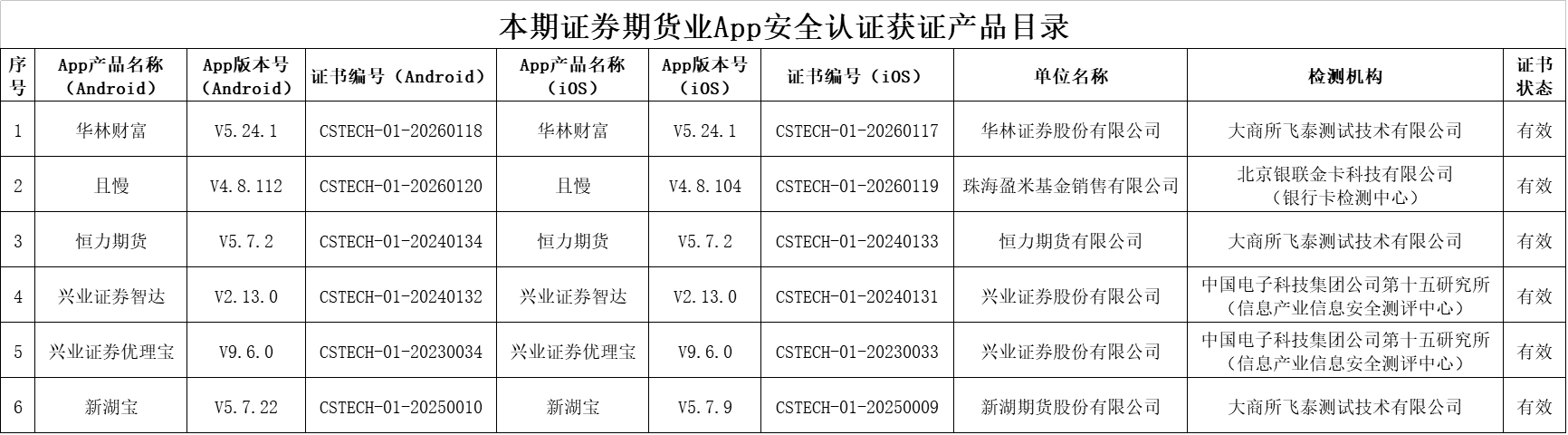 恒力期貨有限公司的“恒力期貨”App等4款通過認證監督審查,符合行業標準《證券期貨業移動互聯網應用程序安全規范》(JR/T 0192-2020)及《證券期貨業移動互聯網應用程序安全檢測規范》(JR/T 0240-2021)要求,其認證證書持續有效。